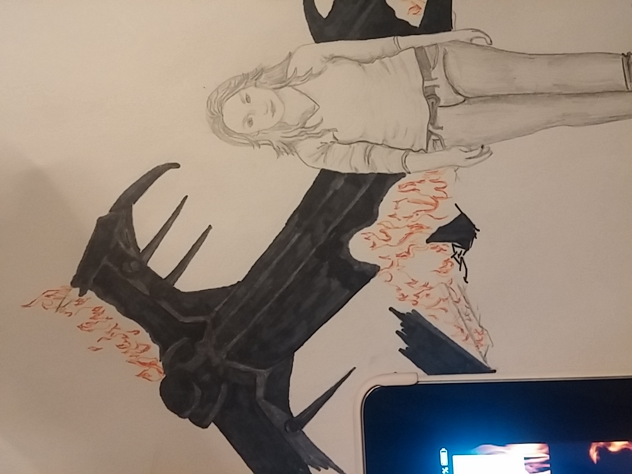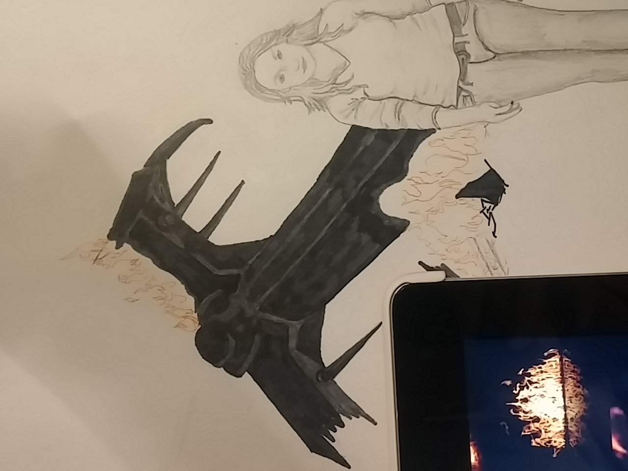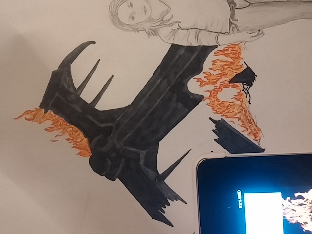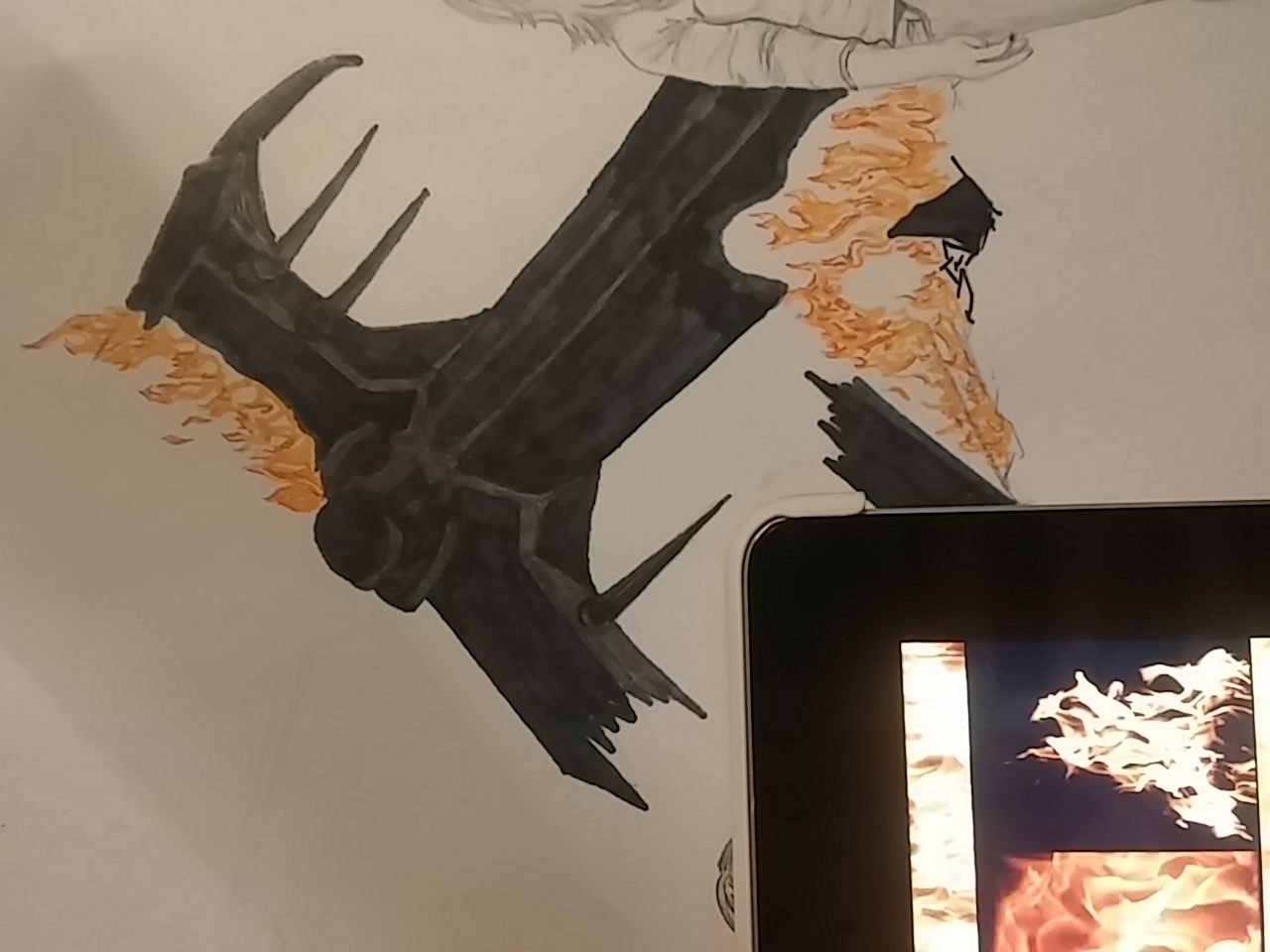 In these shots you can also see my tablet on the side as my reference photos. This sits on my easel nicely, and either has the photo of what I am drawing. or in this case, the googled images of “fire”.